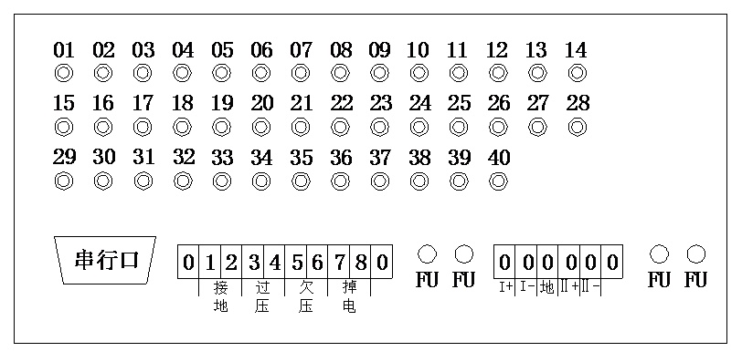 l 后面板上電源輸入接線端子:電源輸入端子為5芯,當(dāng)裝置用在I段母線時(shí)僅接入到I段母線±110V及大地接入端子即可。若裝置用在兩段母線時(shí),其定義I段母線±110V接入端子與Ⅱ段母線±110V及大地接入端子,為四個(gè)保險(xiǎn)分別為:兩段母線±110V的容量為0.5A的保險(xiǎn)管座。
